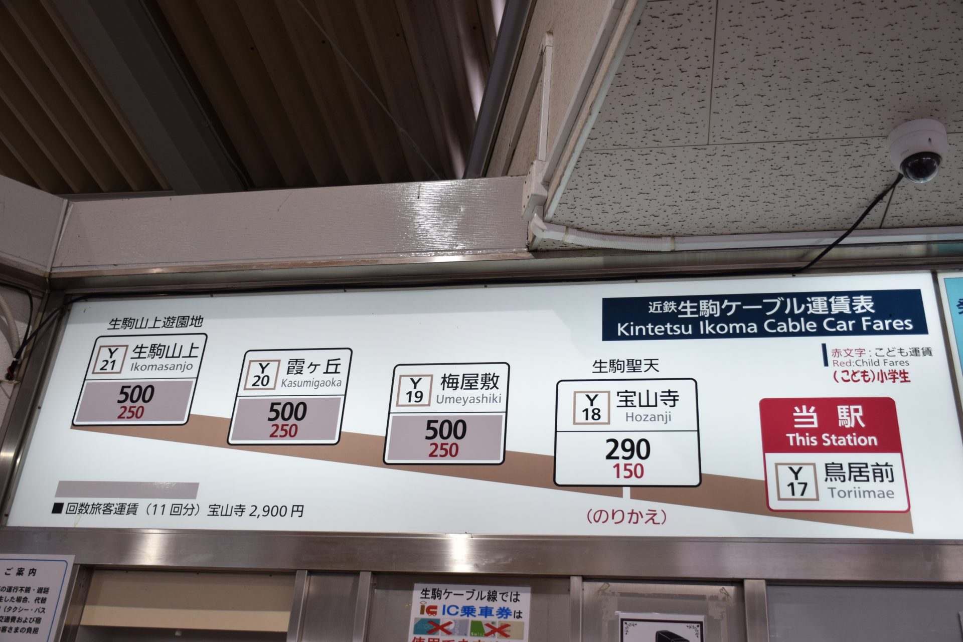 宝山寺駅までは大人290円・子供150円、梅屋敷・霞ヶ丘・生駒山上駅までは大人500円・子供250円です。