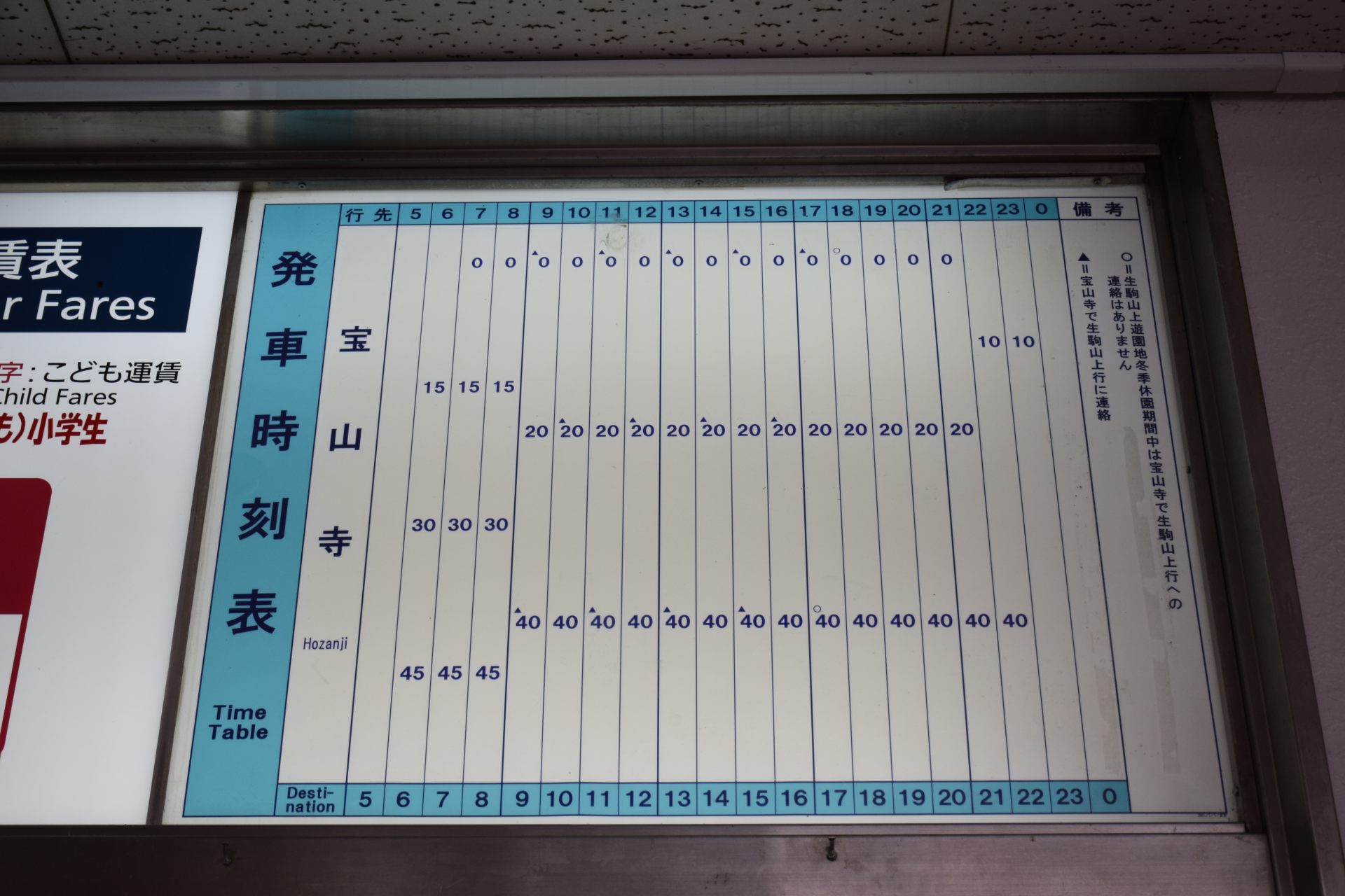 ▲印のついている時間は宝山寺駅で生駒山上行きに連絡していますが、それ以外の時間はかなり待たなければなりません。