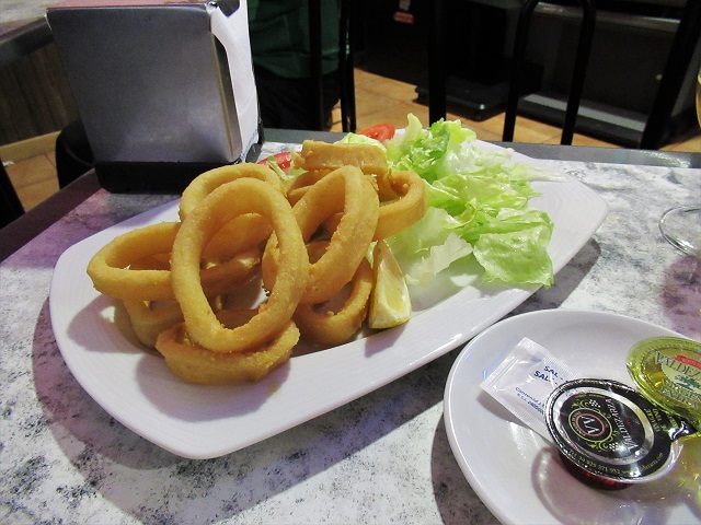 こちらは、「calamares fritos(カラマレス・フリートス)」いかフライ。これ、揚げたて熱々で、おいしかったんですよ。揚げ物は、オーダーしないと食べられない種類のタパスですね。