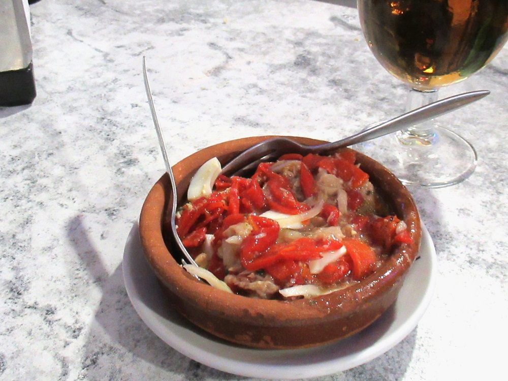 タパス定番のこの料理は「salpicón de mariscos(サルピコン・デ・マリスコス)」。魚介や玉葱、パプリカなどを和えたビネガーの利いた野菜たっぷりのシーフードマリネです。