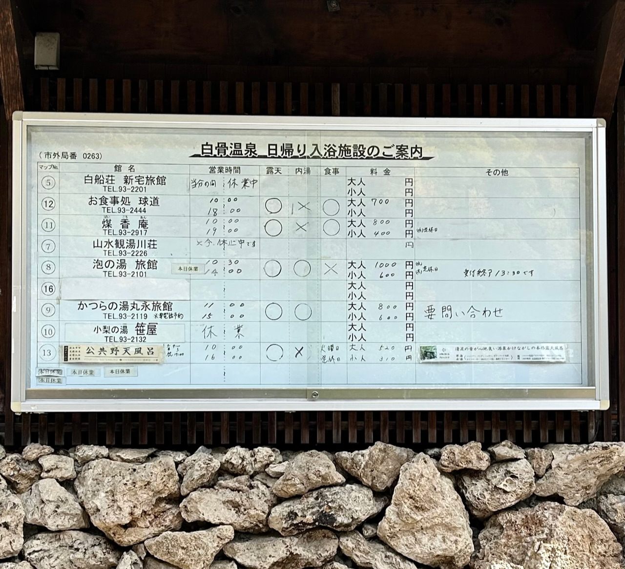 観光案内所のボードに日帰り入浴ができる場所の情報が張り出されています。旅行者にとってはうれしいサービスです。