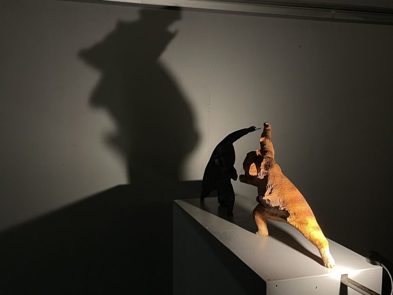 タヌキとネコが合わさると・・・朝鮮半島の地図の影が現れるという作品です。