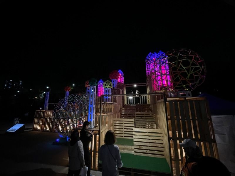 子供たちが楽しめる遊び場もライトアップされていて、夜だけのお楽しみゾーンになっていました。