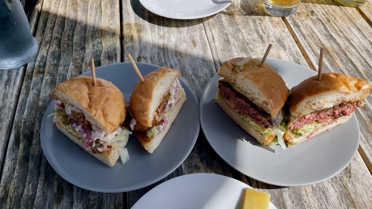 流行りのスマッシュバーガー(Matt's Smash Burger$15)があり、もちろん頼んでみることにしました。そして珍しいフライドグリーントマトのサンドイッチ(Fried Tomato Burrata Sandwitch$14)があったのでそれぞれ半分に切ってもらって食べ比べてみました。+フレンチフライ($10)