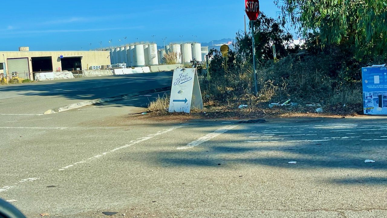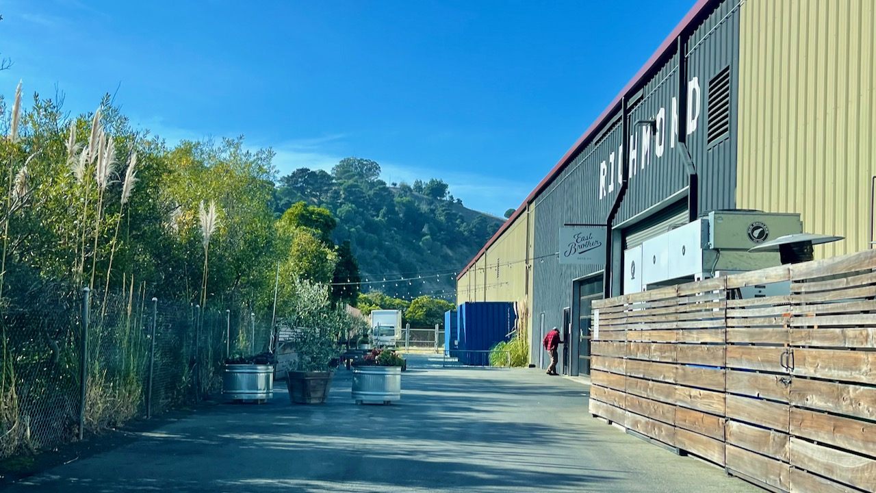 ワイナリーの視察も終わった帰り道。今度行くと言いながら次回まで待てなかったようで、急きょブルワリーを訪ねる事になりました。住所によれば、サンラファエル橋近く、リッチモンド市の港湾地区、工場や倉庫が立ち並ぶエリアでした。どうも倉庫の一角らしいのですが、全くブルワリーらしきものは無く。人に聞くにも人がいない… ようやく見つけた看板。さっきから行ったり来たりしてた道路の草むらにちょこんとある感じで、これじゃ分からんと苦笑。(写真は分かりやすく置いてみた)さっきからウロウロしていた倉庫の裏側がイーストブラザースビールカンパニーの正面でした。