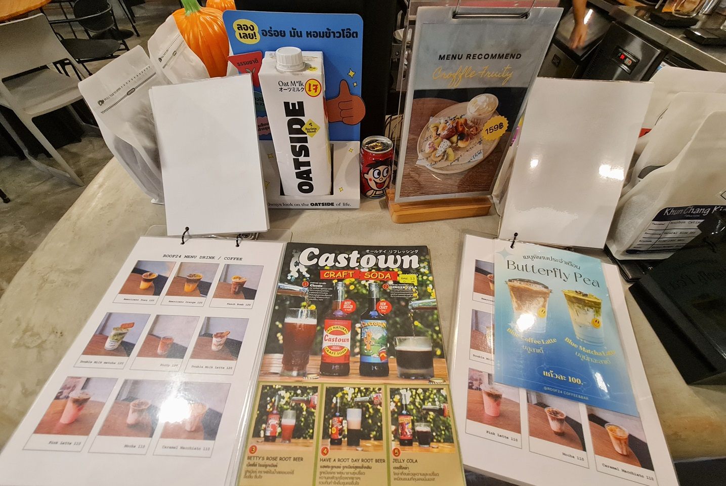 ドリンクの種類はわりとたくさんあります。ホットラテ(タイ語:ラテローン)は本格的な味わいでとてもおいしかったです。食事はスイーツがいくつかある程度でした。