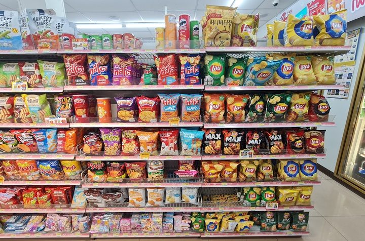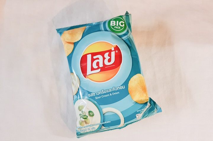 他の国でも生産されているようですが、タイのセブンイレブンで気軽に購入できる、タイ産のポテトチップスといえば、PepsiCo社のLays(レイズ)。小さいパッケージを置いている店舗であれば、10バーツから購入できます。好みは、人によって分かれるようですが、わが家は、オリジナル味、サワークリーム&オニオン味、ほとんど見かけませんがマヨネーズ味がお気に入りです。セブンイレブンで購入する人が多いのか、回転率がよいのか、別の場所で買うよりおいしく感じます。