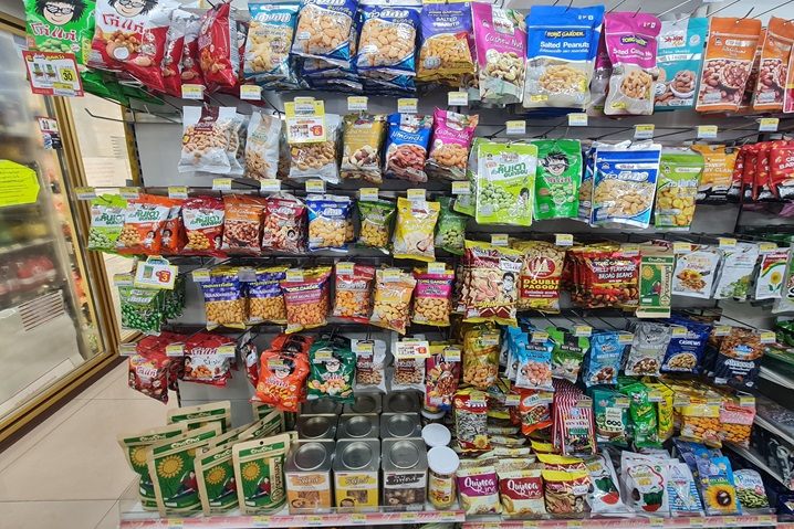 ポテトチップス以上によく購入するのがピーナッツです。ピーナッツも小さいサイズがあれば10バーツ~購入できます。ピーナッツ以外のナッツやドライフルーツもたくさん取り扱っています。お菓子やパンづくりをする方は、タイ・バンコクのコンビニで購入できる!おすすめのナッツ、種、ドライフルーツ(2019年10月22日公開)の記事も参考にしてみてください。
