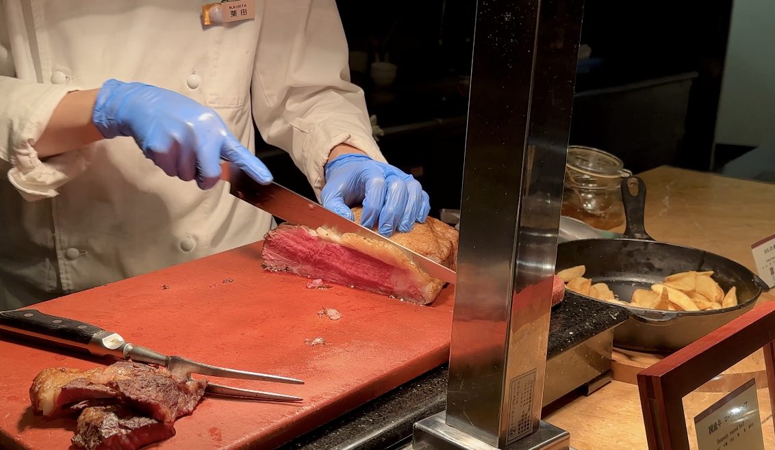 ライブステーションでは、一度スチームし、柔らかくしたローストビーフを目の前で切り分けてくれます。