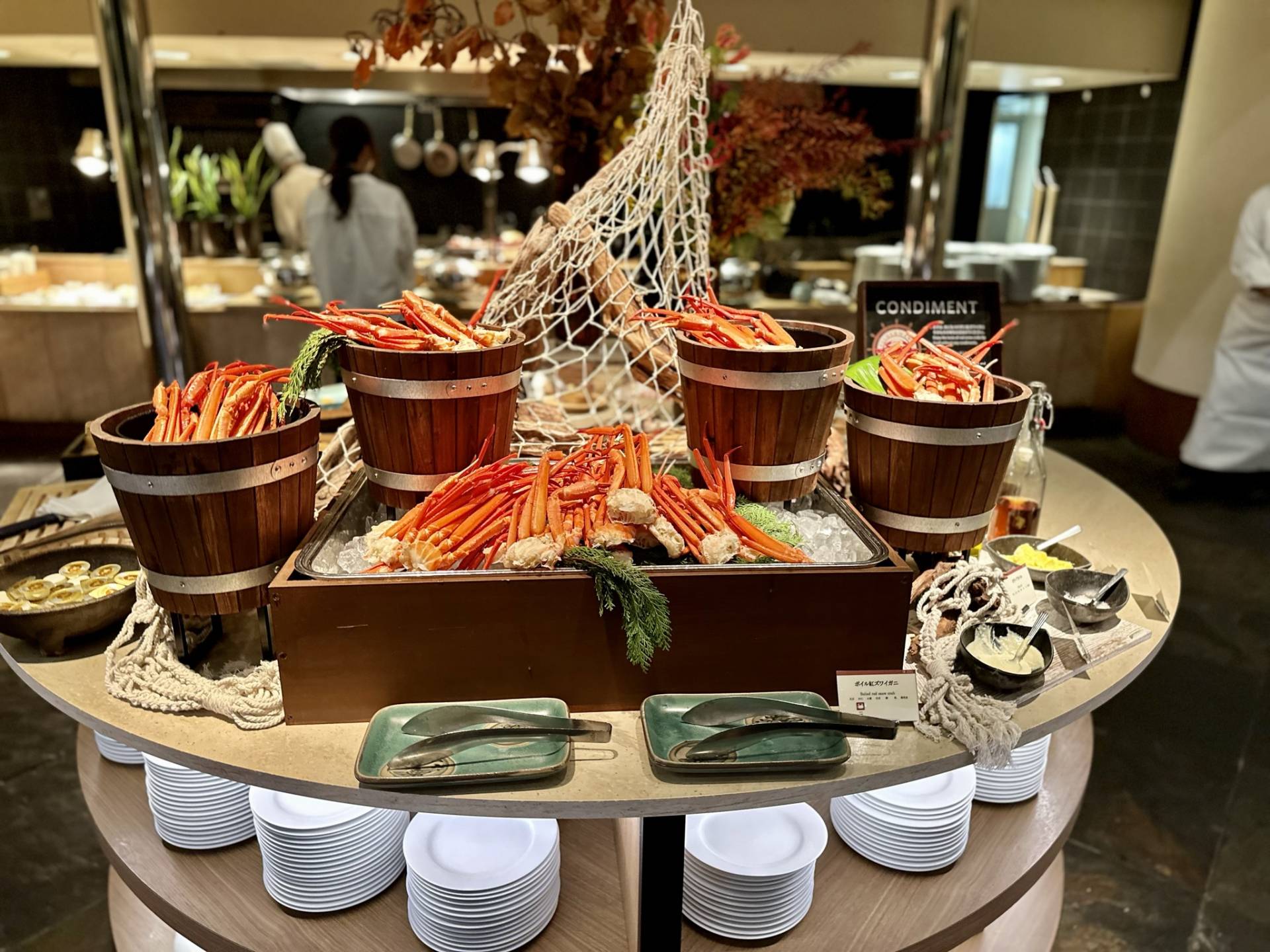 6種のソースで味変しながら楽しめる”ボイル紅ズワイガニ”の食べ放題が始まりました。カニのみならず、ローストビーフなど40種類以上のラインナップでブッフェメニューが楽しめます。お子様も大喜びのキッズスペシャルディッシュもあります。