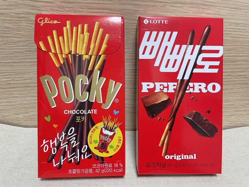 では、元祖ポッキーと韓国のペペロの食べ比べです。ポッキーは韓国でも売られています。今回は比較するために同じ価格(1,000ウォン)で売られている韓国ダイソーで購入しました。