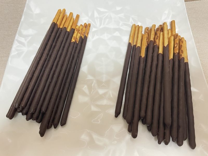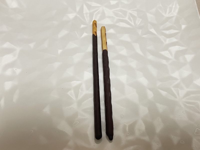 長さはポッキー:13.5cm、ペペロは12.5cmで、ポッキーのほうが1cm長いです。太さは若干ペペロのほうが太めです。肝心のお味の方は・・・ポッキーのほうがチョコレートの風味が感じられ、サクッとしています。ペペロはクッキー感があり、チョコレートの味が控えめでした。