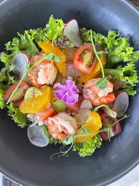 マナド風にアレンジしたエビを使ったサラダです。タマリンドと椰子砂糖の甘酸っぱい特製ソースが効いています。