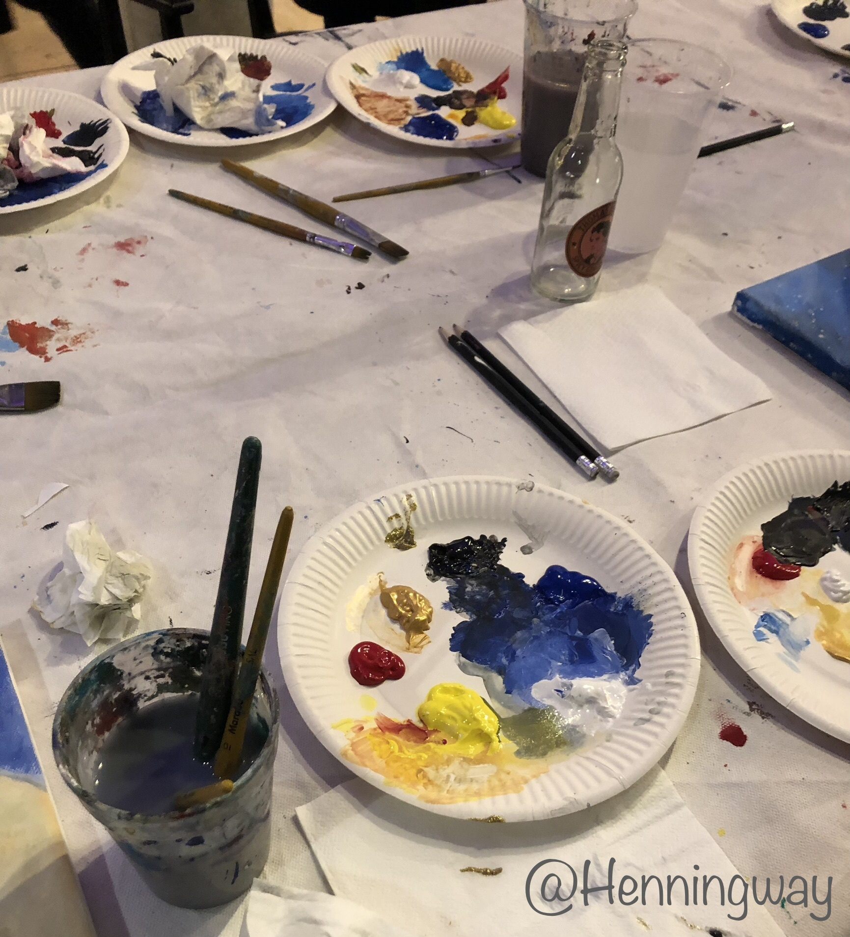 オフラインコースの参加者は手ぶらで会場に訪れ (※オンラインコースは材料は自前で用意)、既に用意されたアクリル絵の具、筆(数種)、キャンバス、筆を洗うための水入り容器、エプロン(※場合によっては、コースごとに必要な絵画グッズ 例:パレットナイフなど)を会場で借りられます。