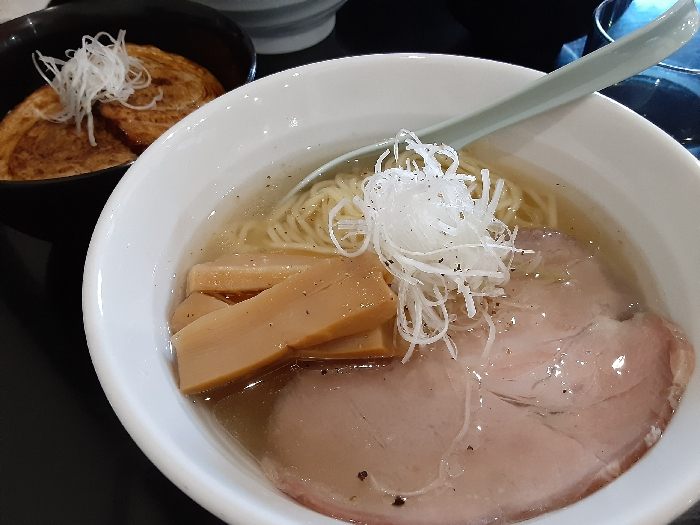しおラーメン 720円 黒色のテーブルに白い器で映えるラーメン!! ワタクシ、このとき塩ラーメンにハマっていたので、しおラーメンをチョイスしましたが透き通ったスープがキラキラ輝いて眩しい!!