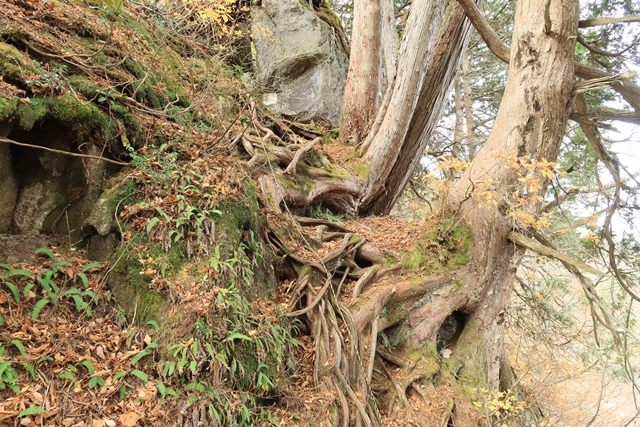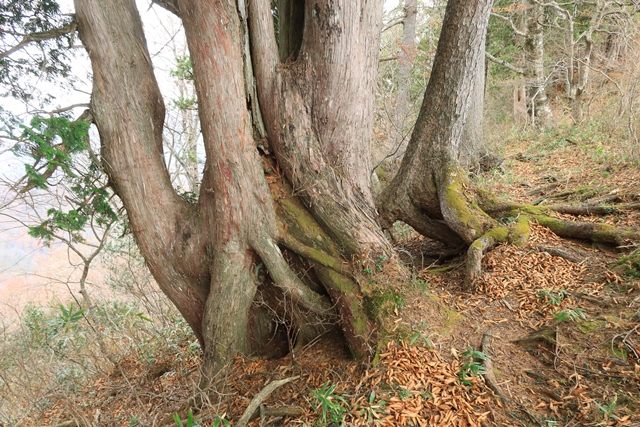 下山は尾根を戻って分岐を近洞寺方向へ。こちらのルートは、往路以上にクロベの巨木が目立つのも特徴的です。