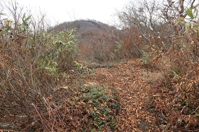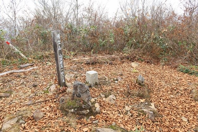 稜線上の小ピークである社峰の頂へ至ると、奥に博士山の山頂部が見えます。ここはかつて、伊佐須美神社があった場所とのことです。