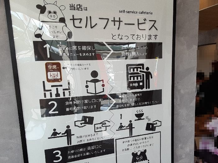 倉吉市(くらよしし)にある「麺屋エーハチ」は、まず席を確保してから各席にあるメニューを見て「よし!これを食べよう!」と決めたら食券機で食券を買い受け渡し口におんさるスタッフに食券を渡します。食後は、返却口に食器を返すセルフサービス的な流れになっています。また、店内、テーブル席、座敷、そして、厨房の様子を堪能できるカウンター席とありました。