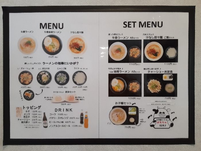 メニューを見ると、牛骨ラーメン、牛骨味噌ラーメン、汁なし担々麺の3種にごはん系でセットもあります。