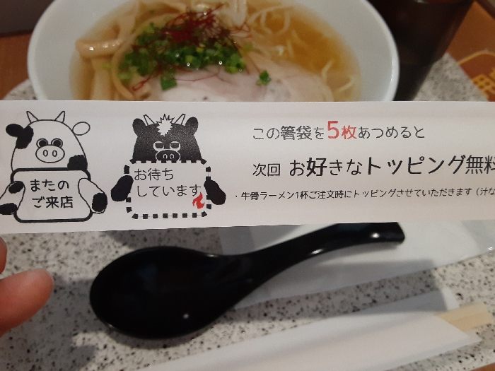 可愛いイラストが描かれた箸袋を見ると、な、なんと、箸袋を5枚集めると、次回お好きなトッピングが無料になるサービスとか嬉しい!! もう、通っちゃう!! 箸袋集めちゃう!!