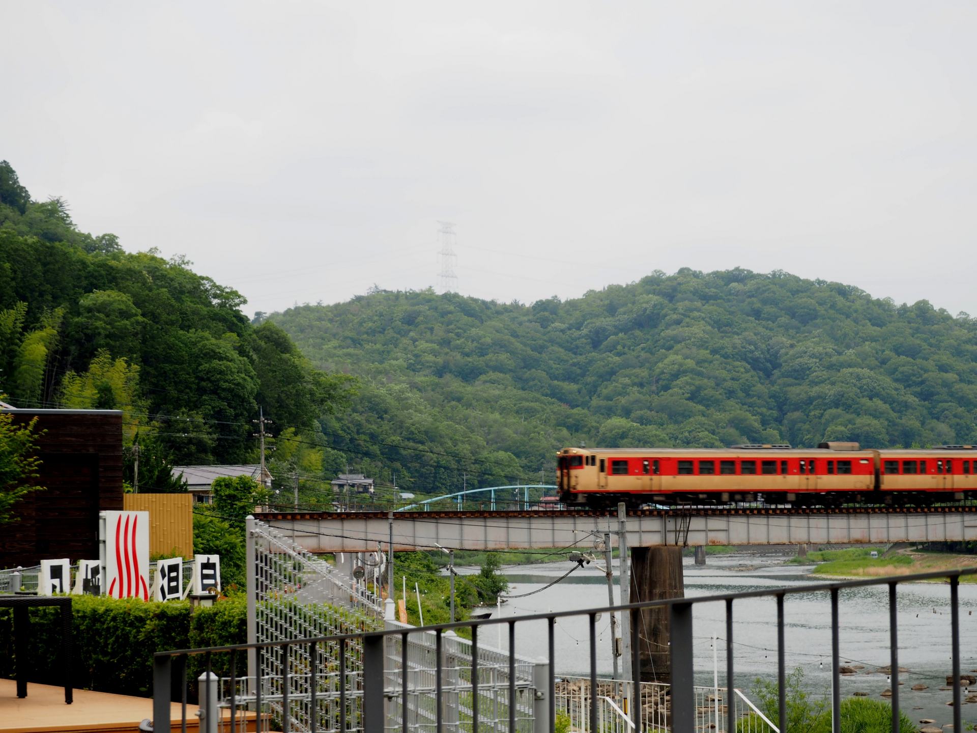 時折、旭川に架かる鉄橋に列車が通ります。撮り鉄の夫の大好物です。今回は「とんかつ定食」を前景(?)にして撮影をしていました。( *´艸`)