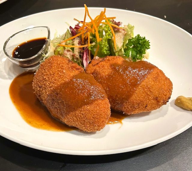 これも肉屋さんのとは違い本物のメンチカツです。薄い衣がカリッとして中にはお肉がたっぷり入って、もう幸せだなぁ〜。