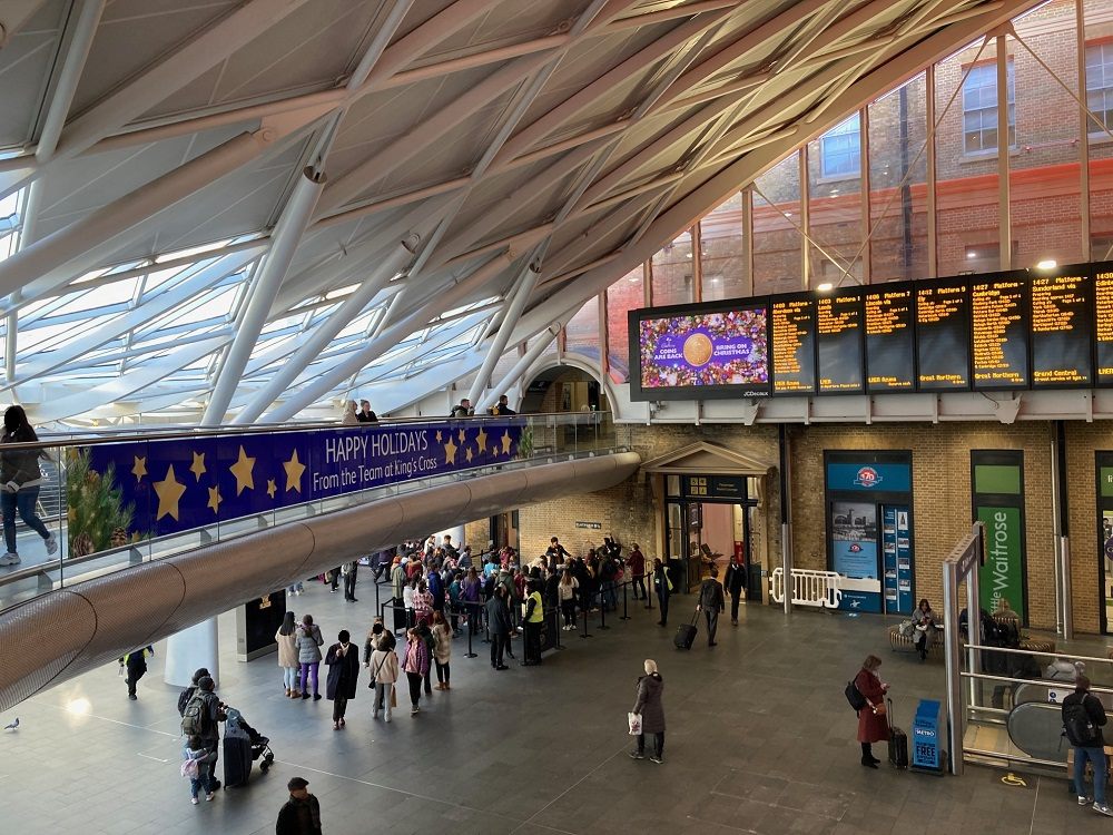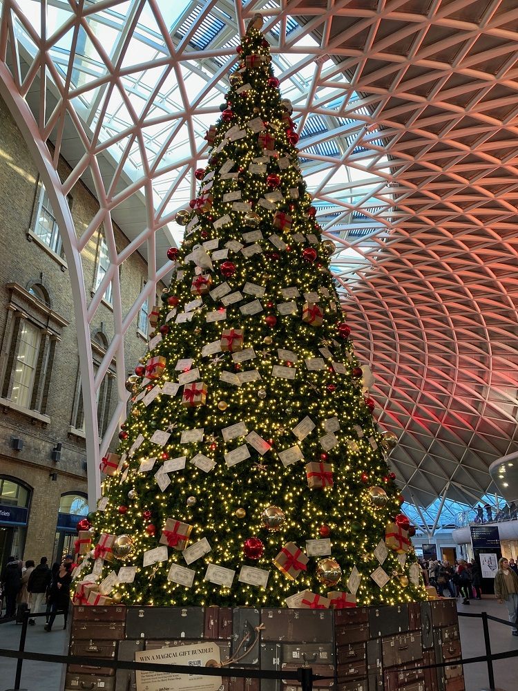 先日ロンドンから北イングランドのヨーク行き急行列車に乗るため、キングズクロス駅を利用しました。今はどの駅もそうですが、ここでも大きなクリスマス・ツリーが出迎えてくれましたよ!