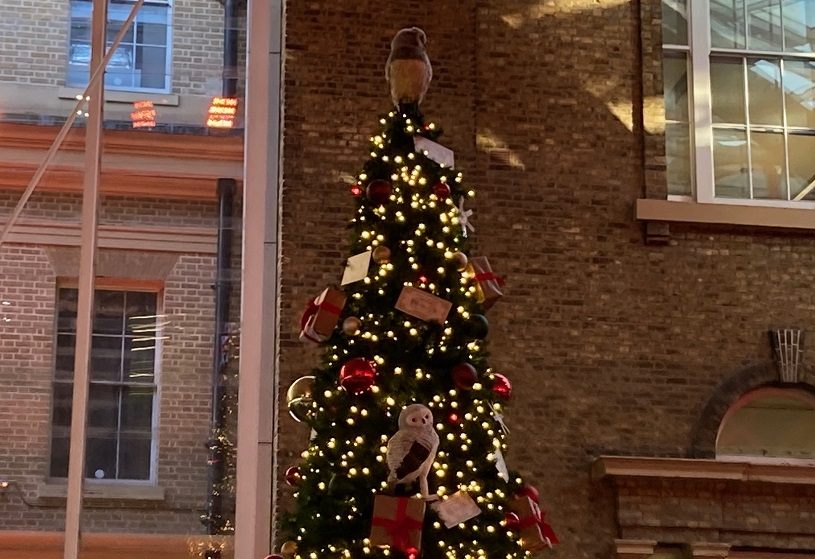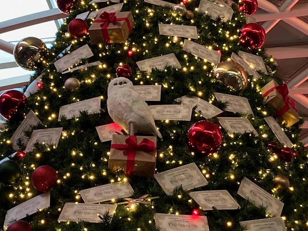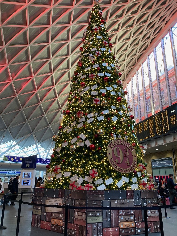 2023年にキングズクロス駅を飾るツリーは、駅ナカにあるハリポタ関連ギフトショップ「プラットフォーム9と3/4番線」がスポンサーなのです。