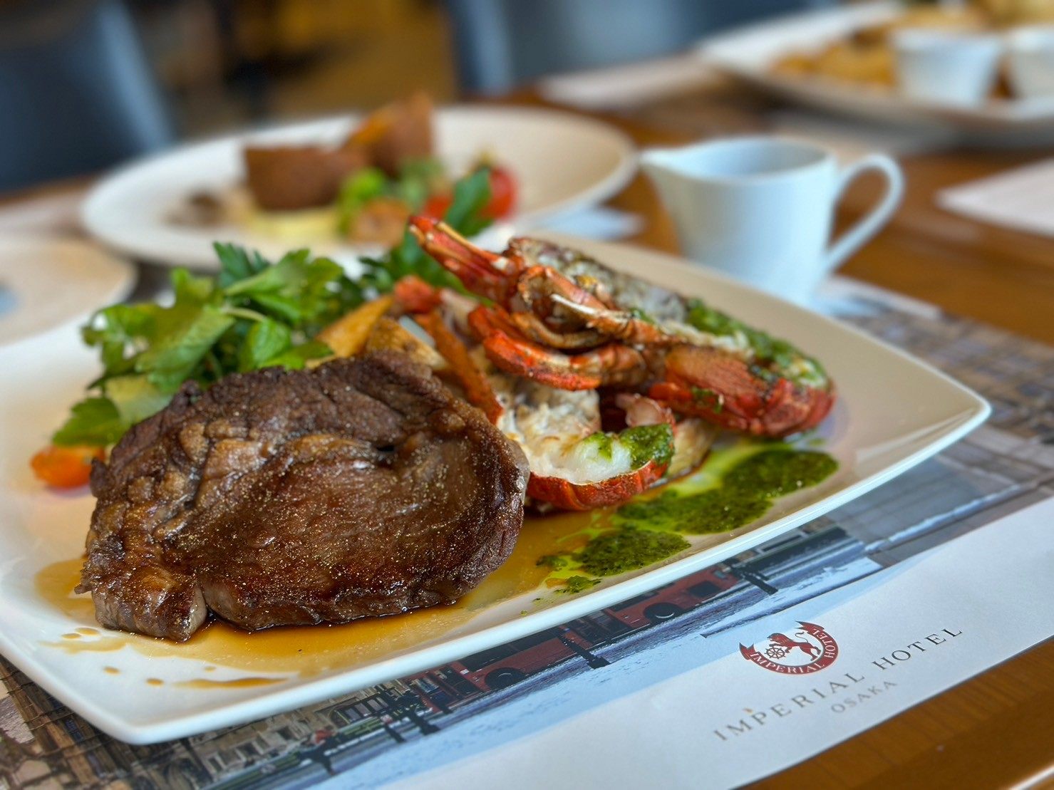 牛リブロースステーキとロブスターグリルの組合せ、見るからにゴージャスです。グレイビーソースと香草バターの2種のソースが添えられているので、さまざまな味わいが楽しめるボリュームのある一皿、おすすめです。