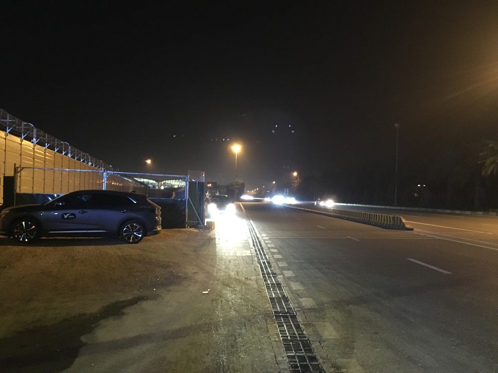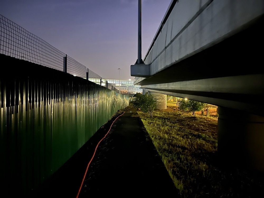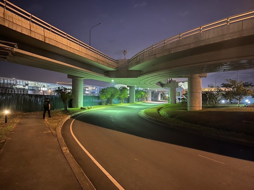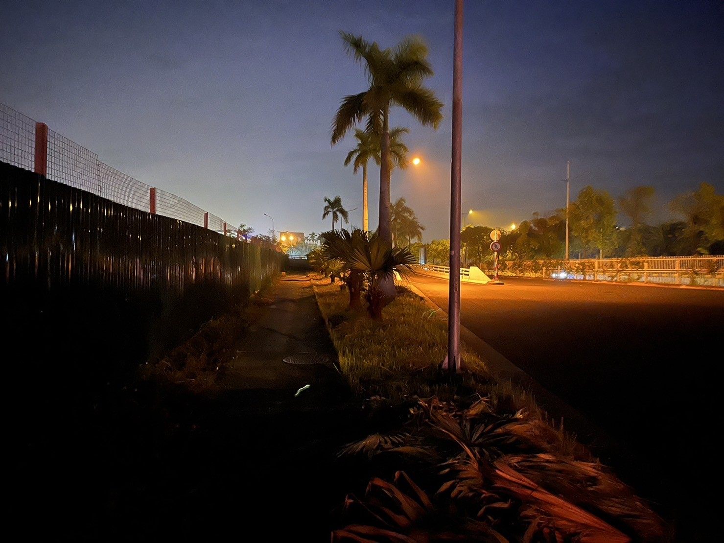 心配していた街灯の明るさですが、煌々とライトが照らされて足元もしっかり見えるくらい明るかったので安心です。心配していた歩道ですが、ホテルから空港方面を見る分には歩道があるようでした。ただこの時点では途中空港に入って行く空港ゲートから先の道の道路状況は分かりません。