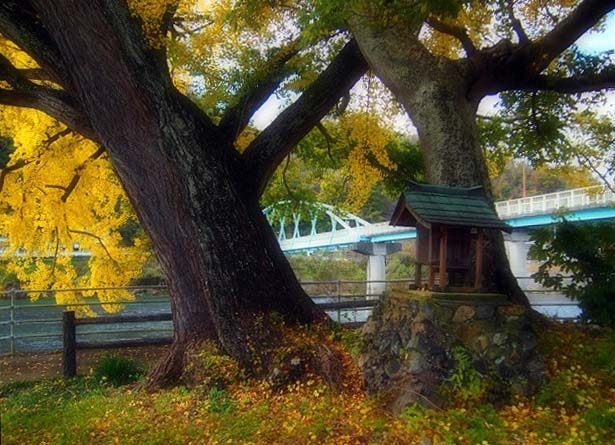ここは、「行こか岡山、戻ろか津山、ここが思案の深渡(ふかわた)し」とうたわれてきた旭川の福渡側(津山藩)です。川をのぞき込むように立つ公孫樹は、ずいぶんと立派でしょう。高さが26㍍、樹齢約180年で岡山市の指定天然記念物です。緑から黄色へのグラデーションに見えるのは