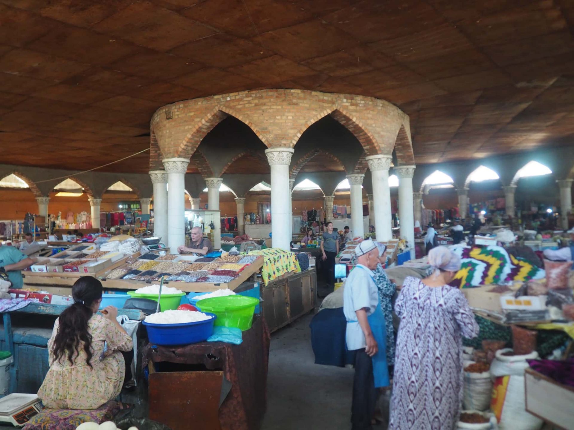 私のパンジャケントいちばんのお気に入りの場所はバザール。バザールなんてウズベキスタンでもさんざん訪問してきたし……という方こそぜひ訪れてほしいのです。ウズベキスタンのバザールはどこも新しく改修され、言葉を選ばずに言えば、どの都市のバザールも建物にたいした違いがない量産型市場と化していますが、このバザールは建物が古いまま残されているのが一目瞭然。外観、内部、どこを撮っても絵になるバザールなのです。