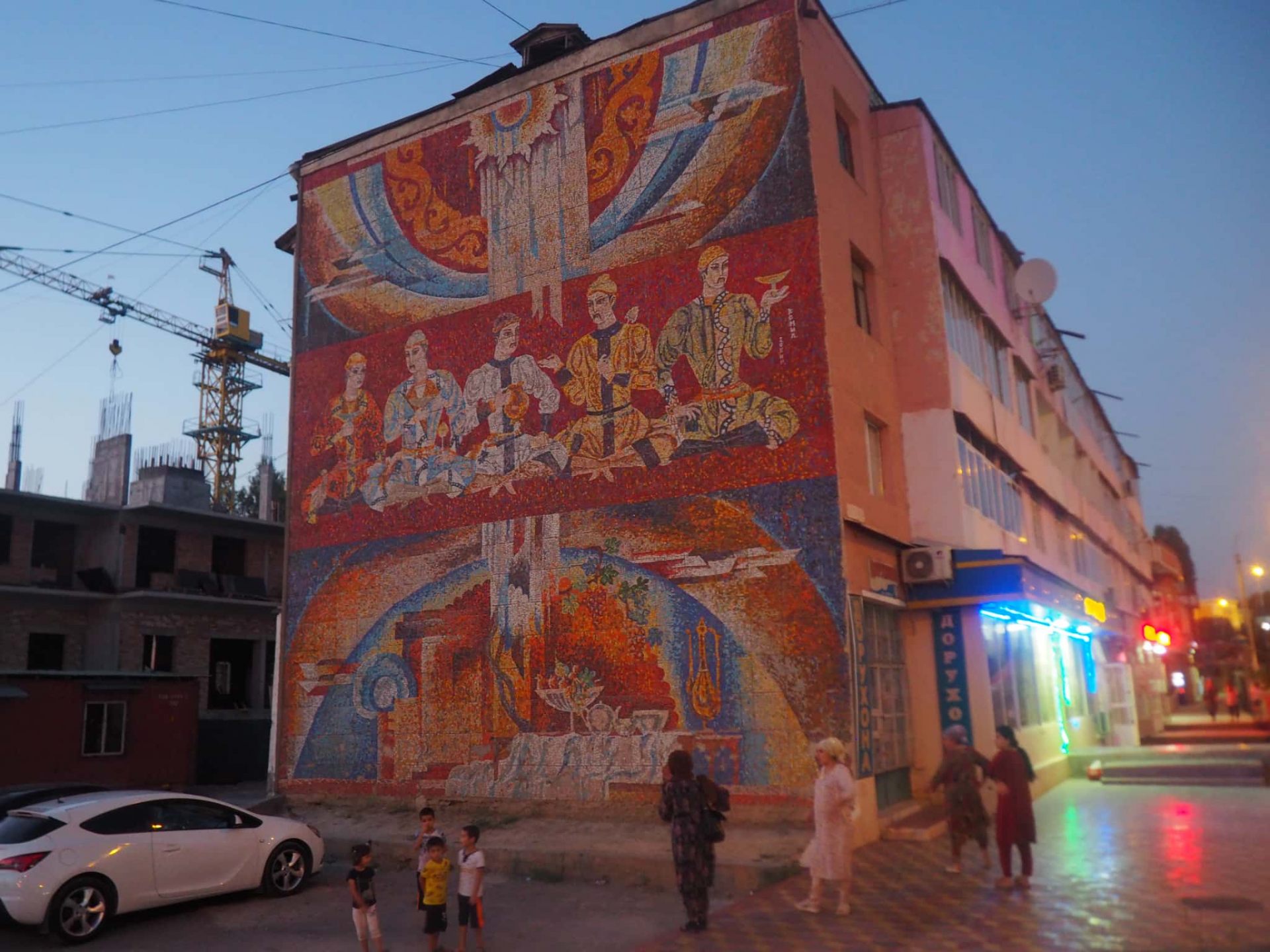町を散歩してみても、ソ連時代に建てられた貴重なものが今でも多く残されていることが分かります。Rudaki通り沿いにはこの見事なタイル画。ソグド人が残した壁画をイメージしているようです。