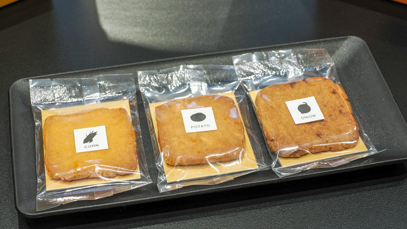 ポテトは中でも一番やさしい味、コーンは"とうきび”の自然な味をしっかり感じるクッキーで、オニオンは北海道産タマネギならではの深い甘みを感じます。