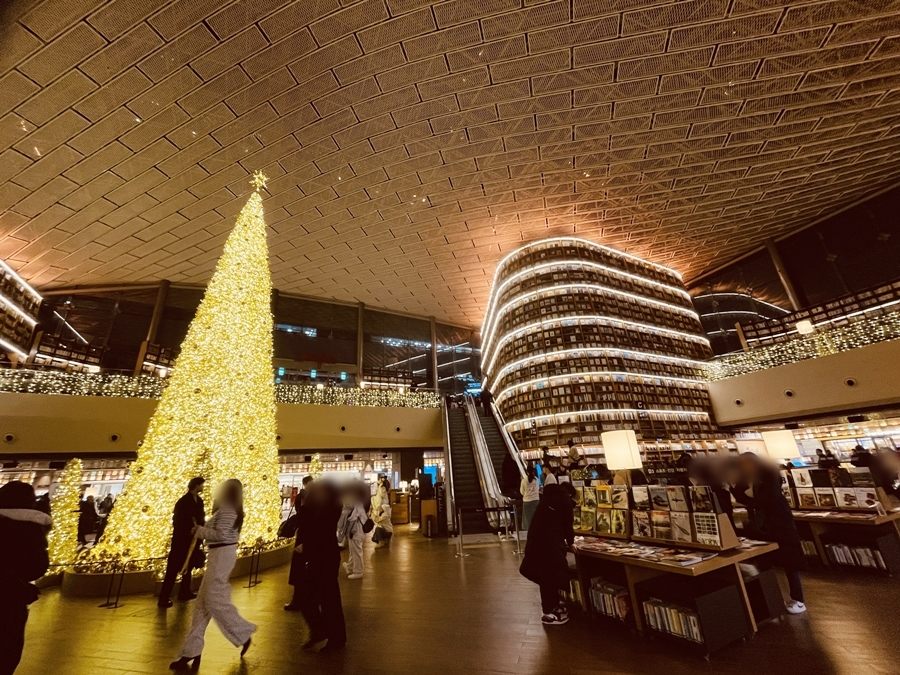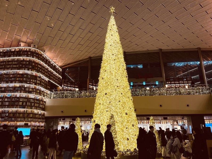 地下鉄2号線 三成駅 6番出口を出ると、ショッピングモールのスターフィールドCOEXモールがあります。その中にビョルマダン図書館のクリスマスツリーがあり、夜はライトアップしています。2月初めまでクリスマスツリーがあり、毎日18時~22時まで15分ごとにライトショーがあるので、ぜひ見てみてください。※水曜、金曜は講演のため19時~20時30分の間、ライトショーはありません。