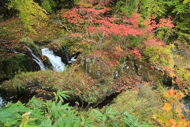 進みゆく紅葉と複雑な流れが美しいものの、全体像は掴めません…こちらの魅力を満喫するには、やはり滝壺側からの様子を押さえたいところです。
