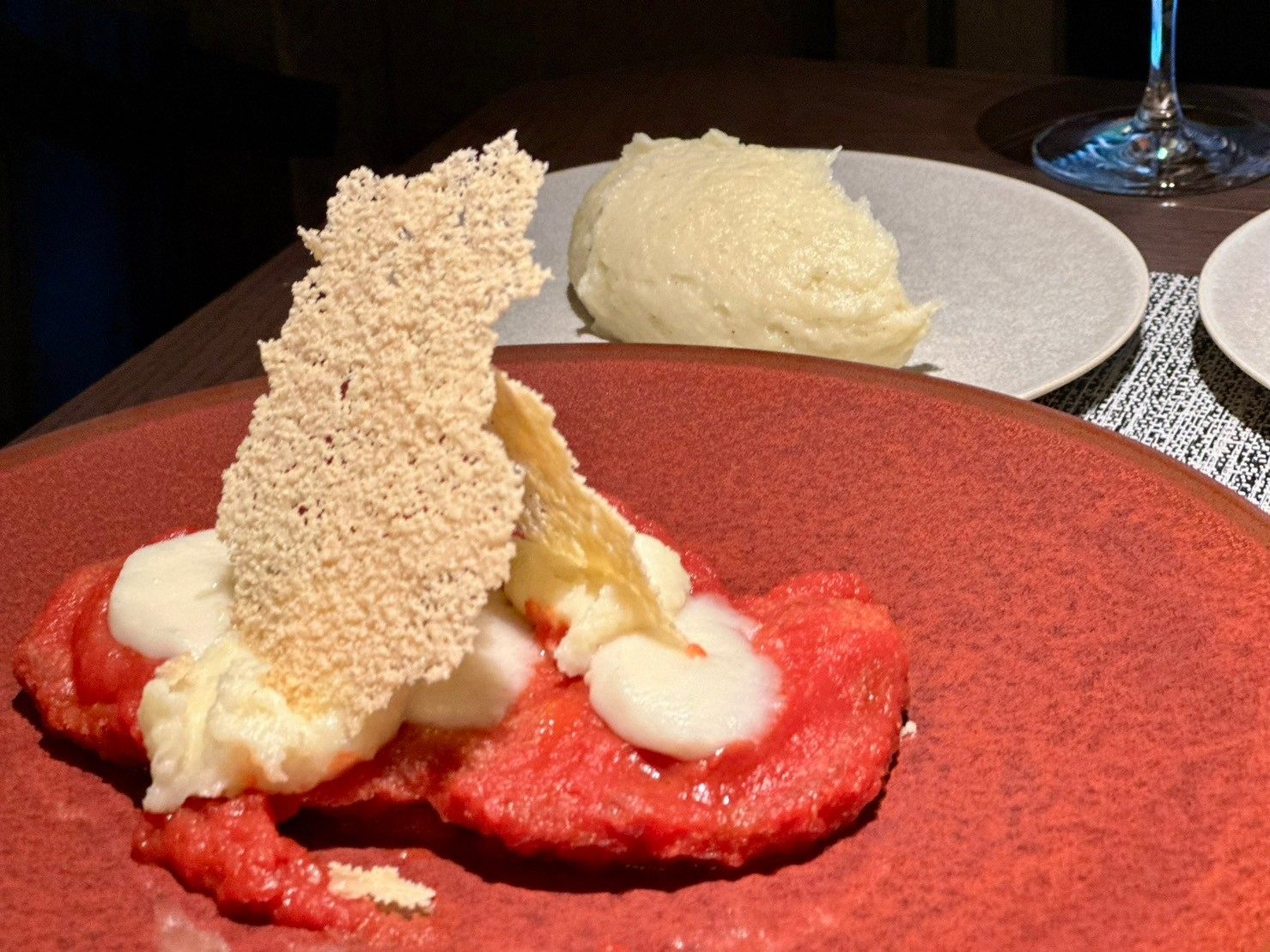 モッツァレラチーズがとろ~り、パルメザンのチュイルがシャキシャキ、食感の違いが楽しめます。下のポークカツレツは京都府産「京都ぽーく」。トマトソースと絡み、柔らかいポークの旨味が口に広がります。