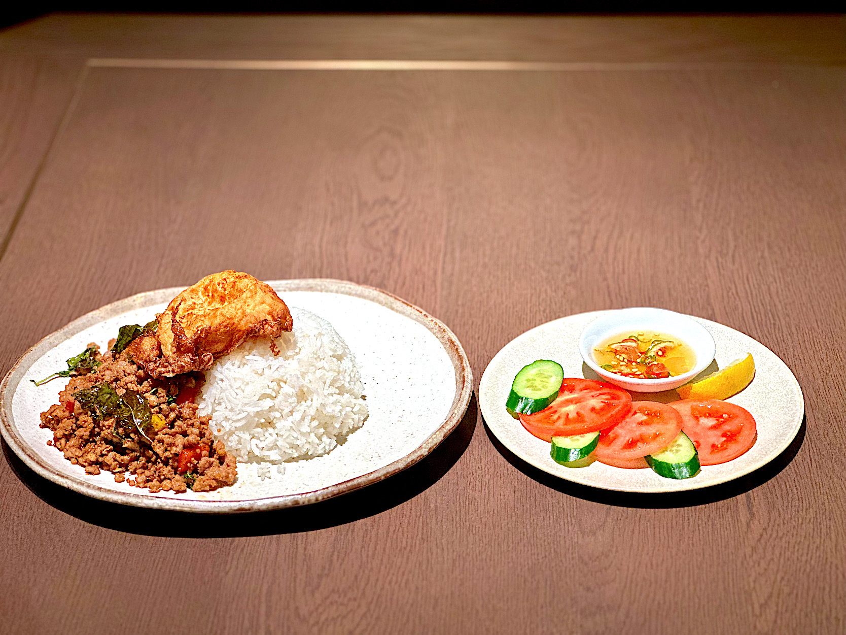 洋食やタイ料理など、様々な種類のメインディッシュからお好きな一皿が選べます。今回、友人と2種選びました。