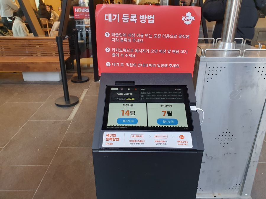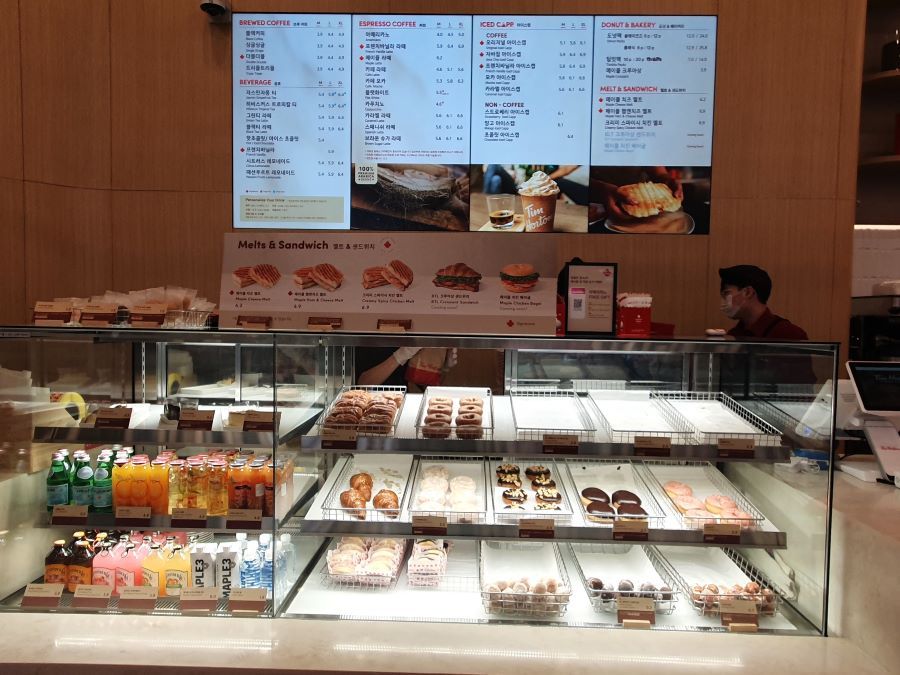 FIVE GUYSから地下鉄7号線「新論峴」駅のほうに進むと、3番出口のすぐ隣に韓国に初上陸したカナダでは多くの人から愛されているというカナダ発のコーヒー&ドーナツショップ「ティムホールトン」1号店があります。