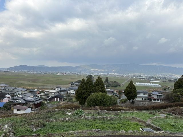 同店の裏、道の駅西側は展望デッキがあり、筑後平野が広がっています。よく見ると、段々になった斜面には石で囲われた花壇のようなものがわずかに草の間から顔を覗かせています。