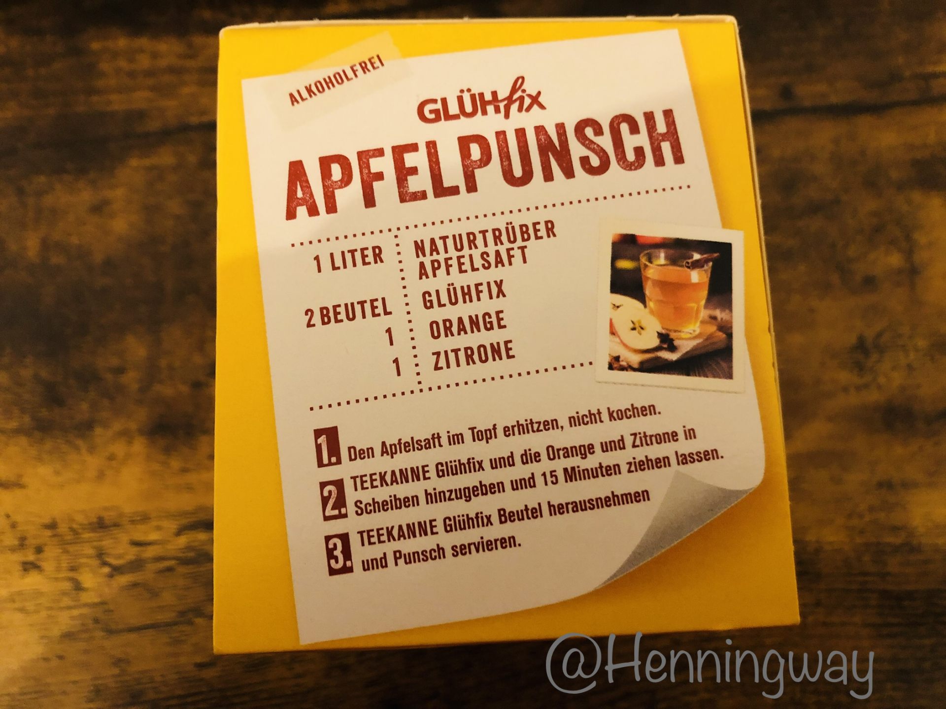 また、こちらを使用してスパイスのきいたノンアルコールの身体の温まるドリンクApfelpunsch(リンゴパンチ)も作れるとのレシピが箱に記載がありました。(写真参照)