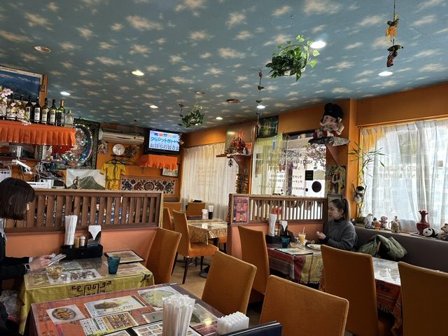 店内はオレンジを基調とした内装で、インドの神様ガネーシャやゾウの飾り、置物に混じってなぜかパンダやクマ、アンパンマンのぬいぐるみまでいるという国際色豊かな顔ぶれが並びます。