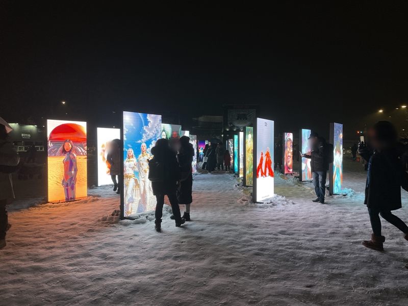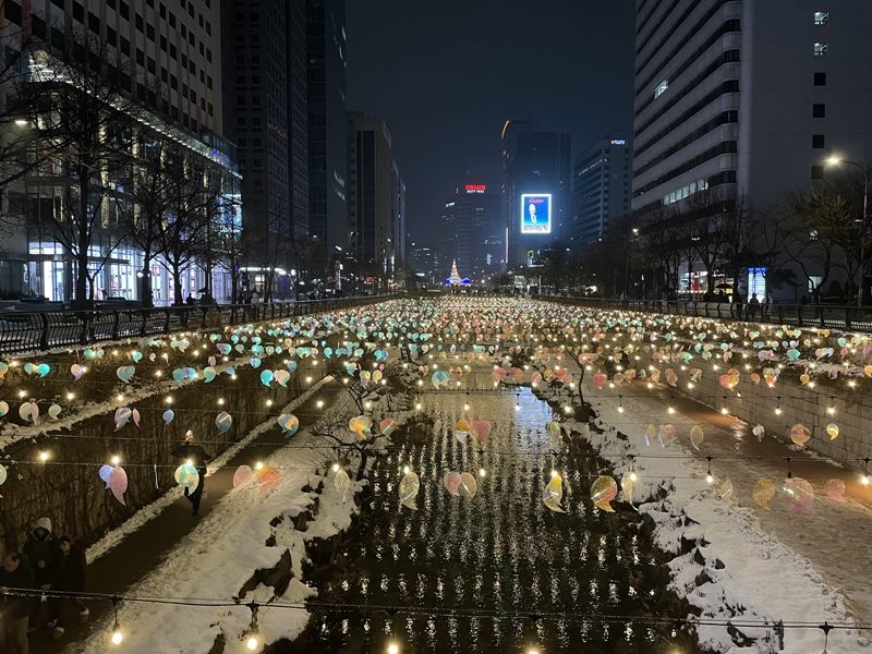 普信閣から明洞方面へ向かう途中に清渓川(チョンゲチョン・청계천)があります。清渓川もソウルランタンフェスティバルの会場でキラキラとライトアップされていました。雪が積もっているので、冬らしい写真を撮ることができます。