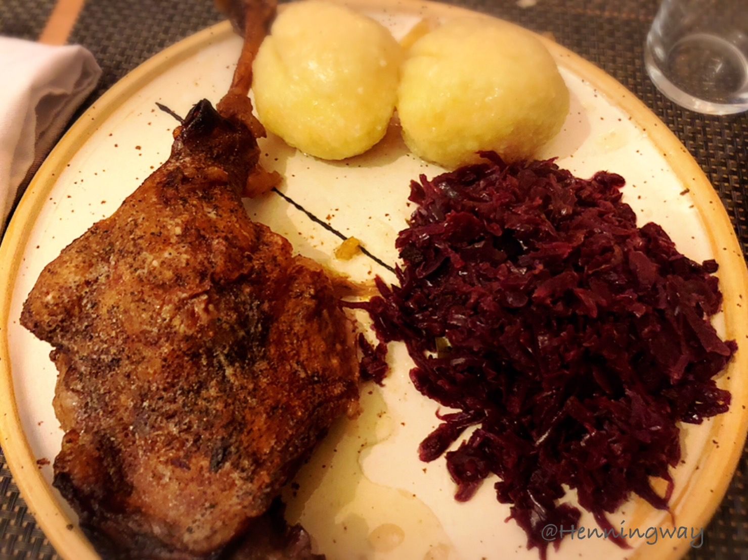 オーブンでじっくりと味付けしたガチョウを焼き、周りの付け合わせは「クネーデル(Knödel)」というジャガイモのもちもちしたお団子のようなものと、「紫キャベツ・ロートコール(Rotkohl)」をリンゴやシナモンなどで味付けしたものと一緒にして出すのが伝統的なスタイルだそうです。