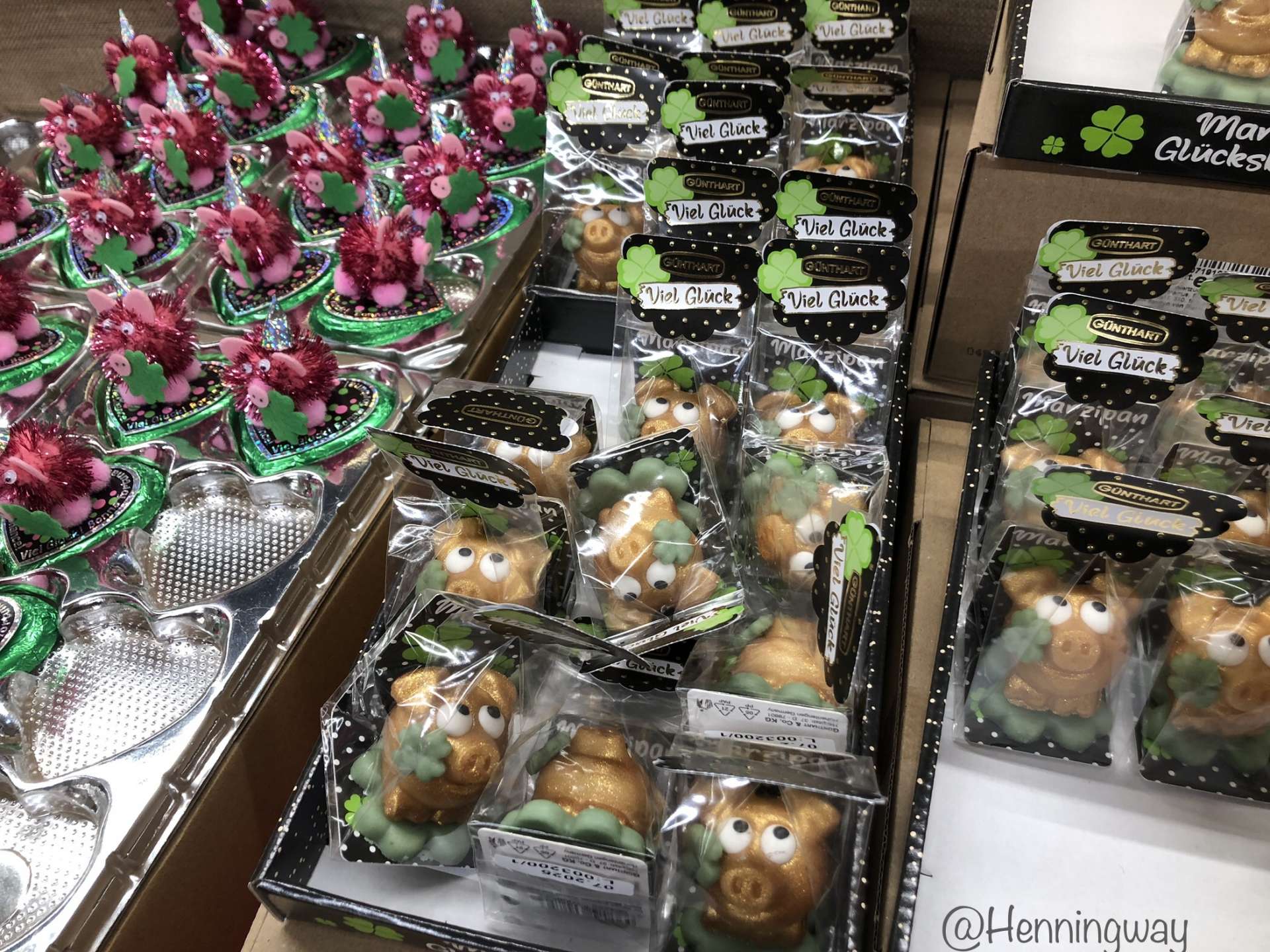 このブタのお菓子を、大晦日(ドイツではジルベスター「Silvester」といいます)に贈りあう習慣があるため大量のブタのお菓子が売られています。