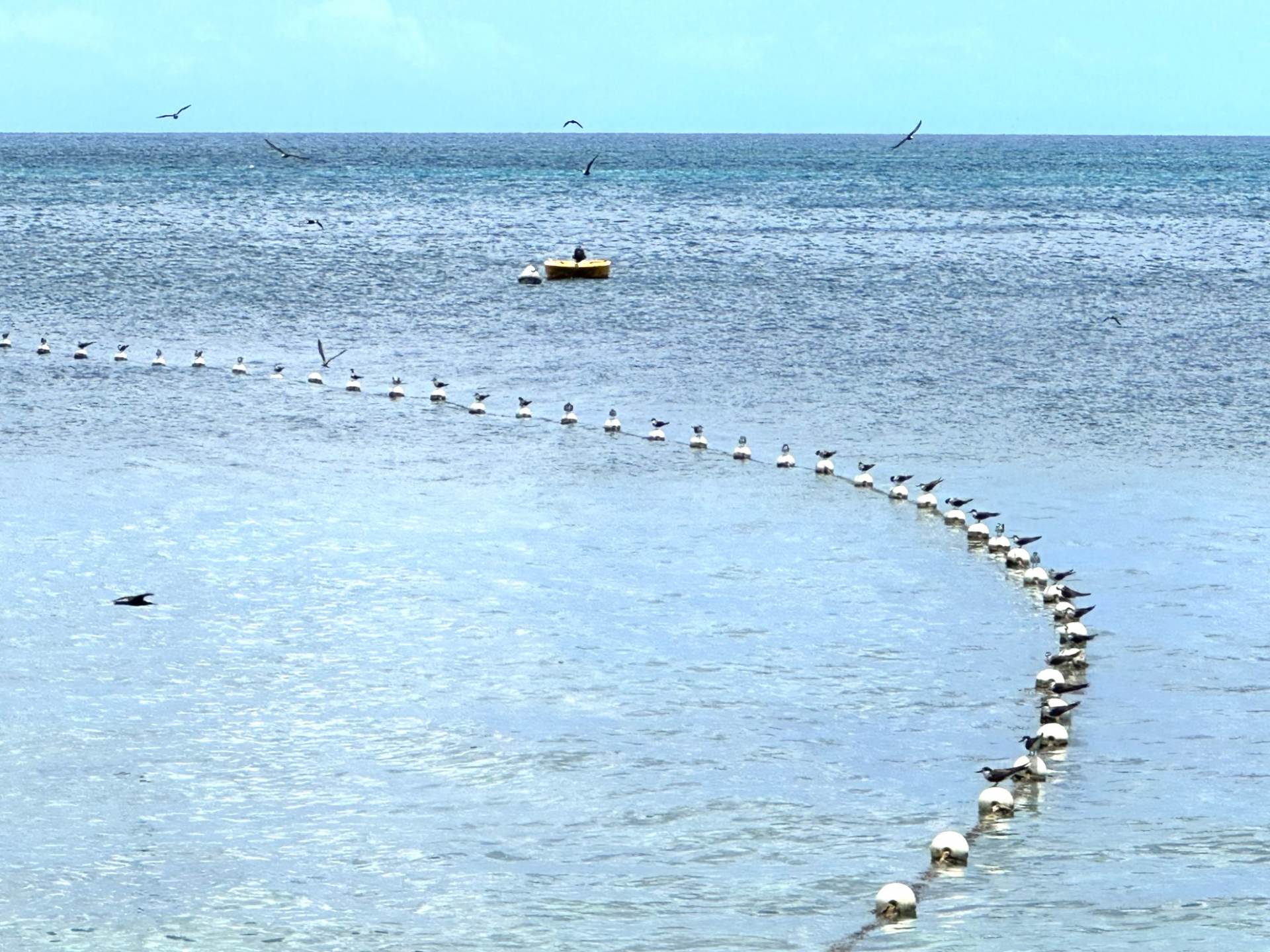 カモメのブイ乗り行列、初めて見ました! 規則正しく順番にとまり、お出迎えしてくれているようです。