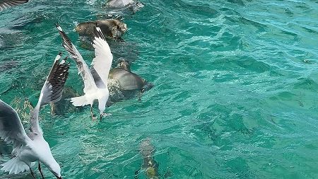 キャプテンが餌をやるたびに、カモメや小さなサメや魚たちが食べに来ます。
