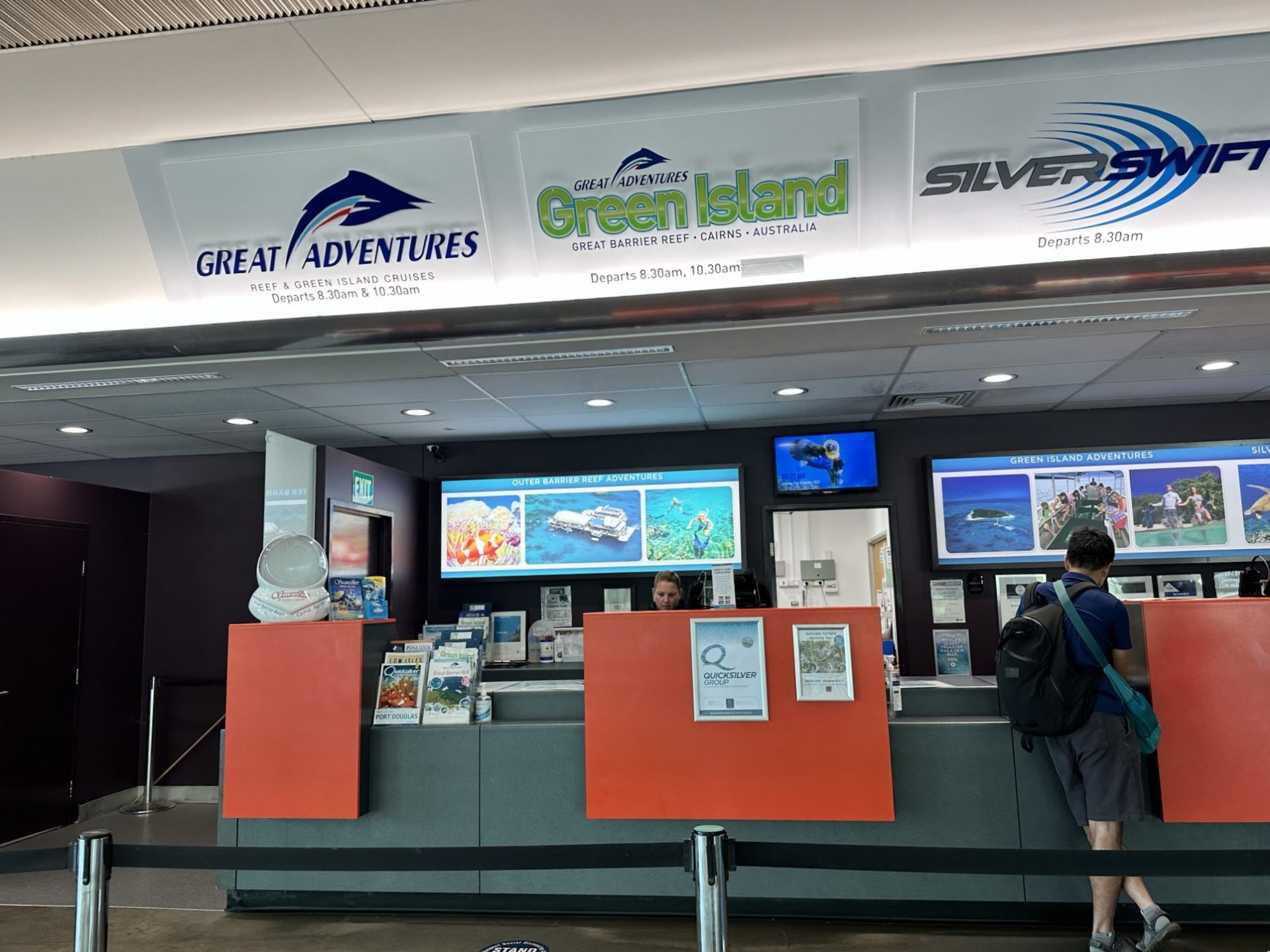 前日に現地のツアー会社に申込をし、申込完了バウチャーをリーフフリートターミナル内のチケットカウンターに見せると、チケットと交換してくれ、高速船と停泊場所、そして集合時間を案内してくれます。