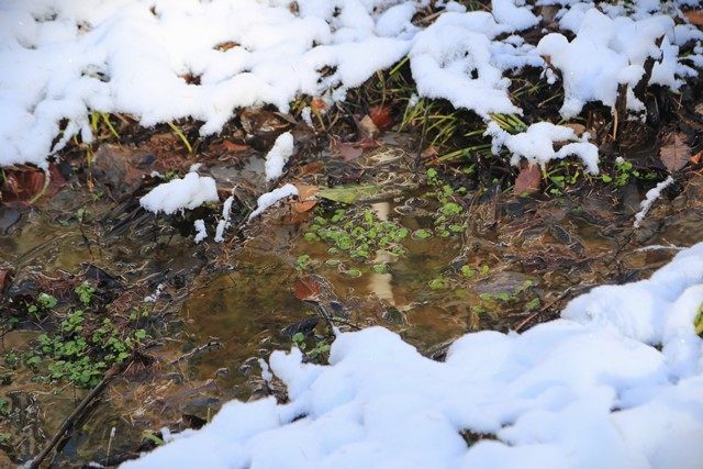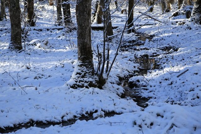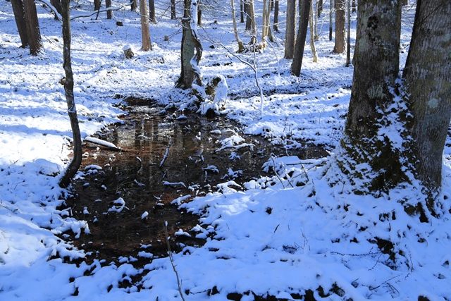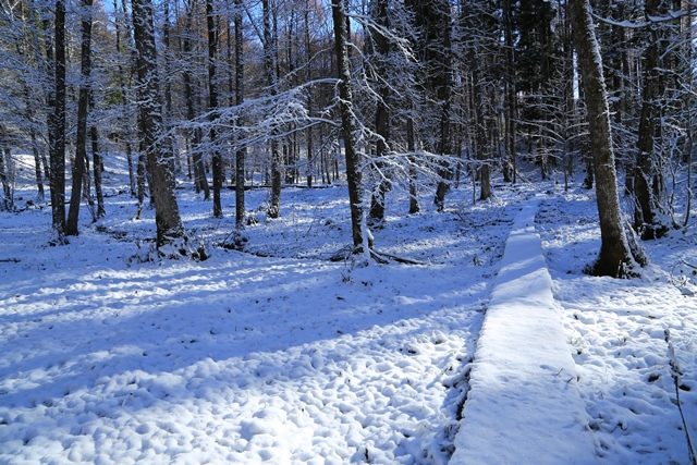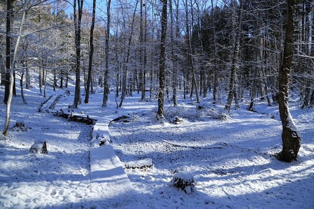 <a href="https://shimogo.jp/sightseeing/kannonnumashinrinkoen/" target="_blank">観音沼</a>近くにある小さな湿原です。薄っすらと雪に覆われた木道を散策してみました。