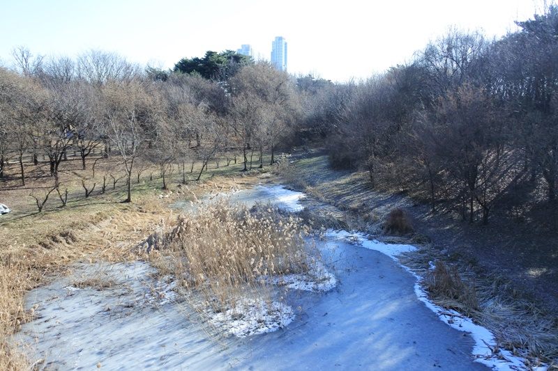 橋の両サイドからカチカチに凍った池が見え、ソウルの寒さを物語っています。